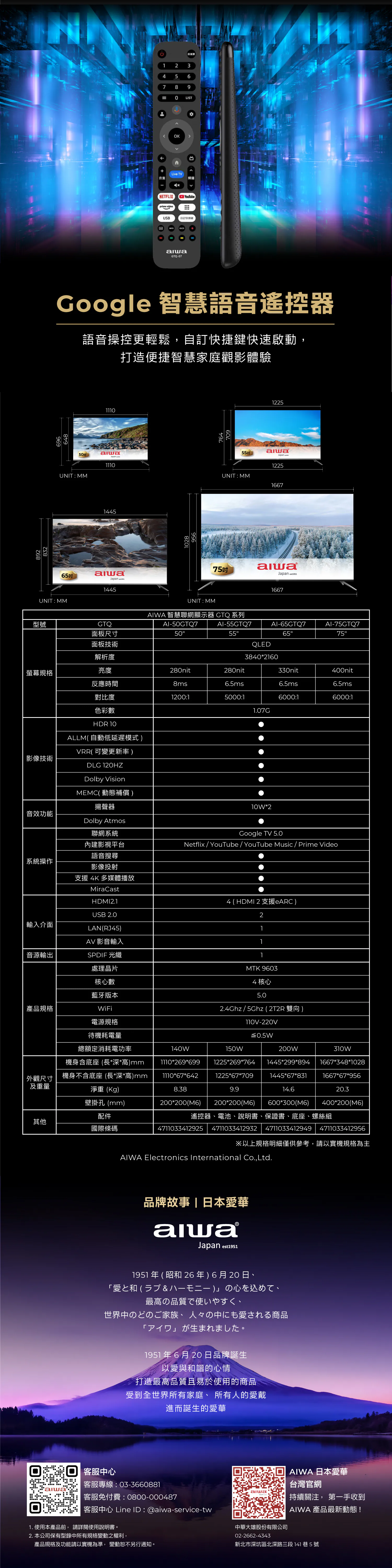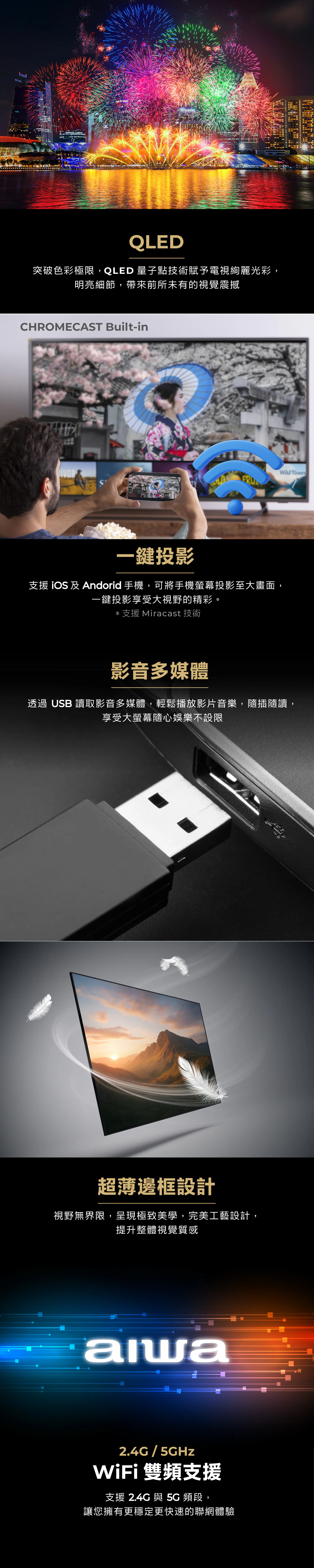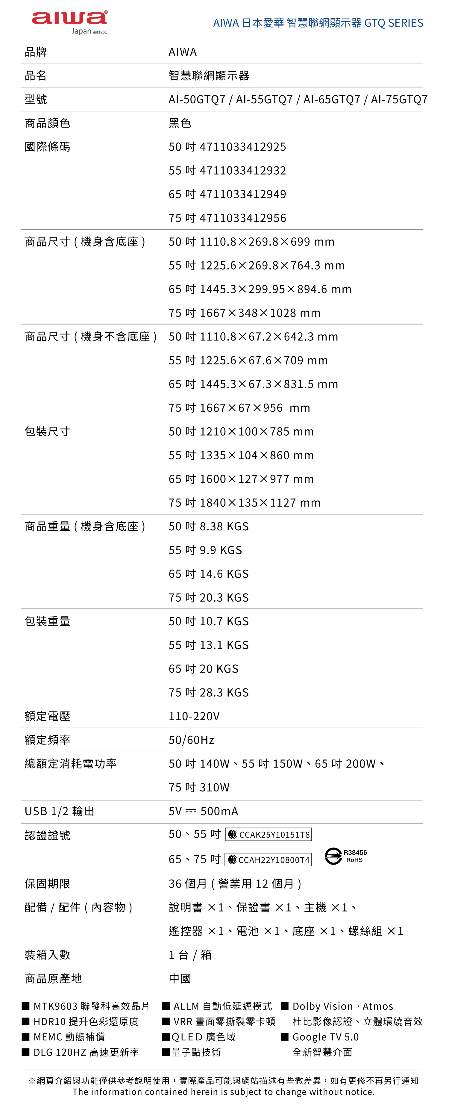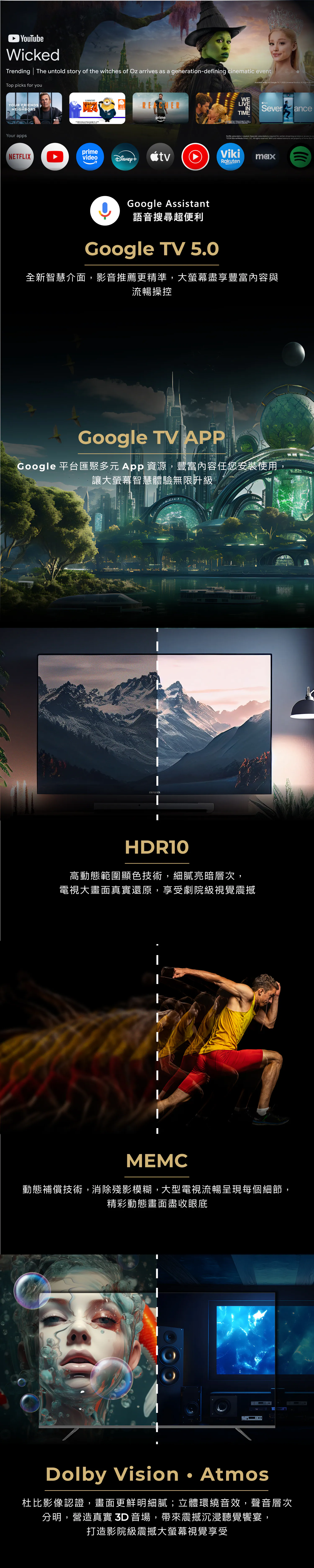 .MTK9603 聯發科高效晶片.HDR10 提升色彩還原度.MEMC 動態補償.DLG 120HZ 高速更新率.ALLM 自動低延遲模式.VRR 畫面零撕裂零卡頓.QLED 廣色域.量子點技術.Dolby VisionᆞAtmos 杜比影像認證、立體環繞音效.Google TV 5.0 全新智慧介面