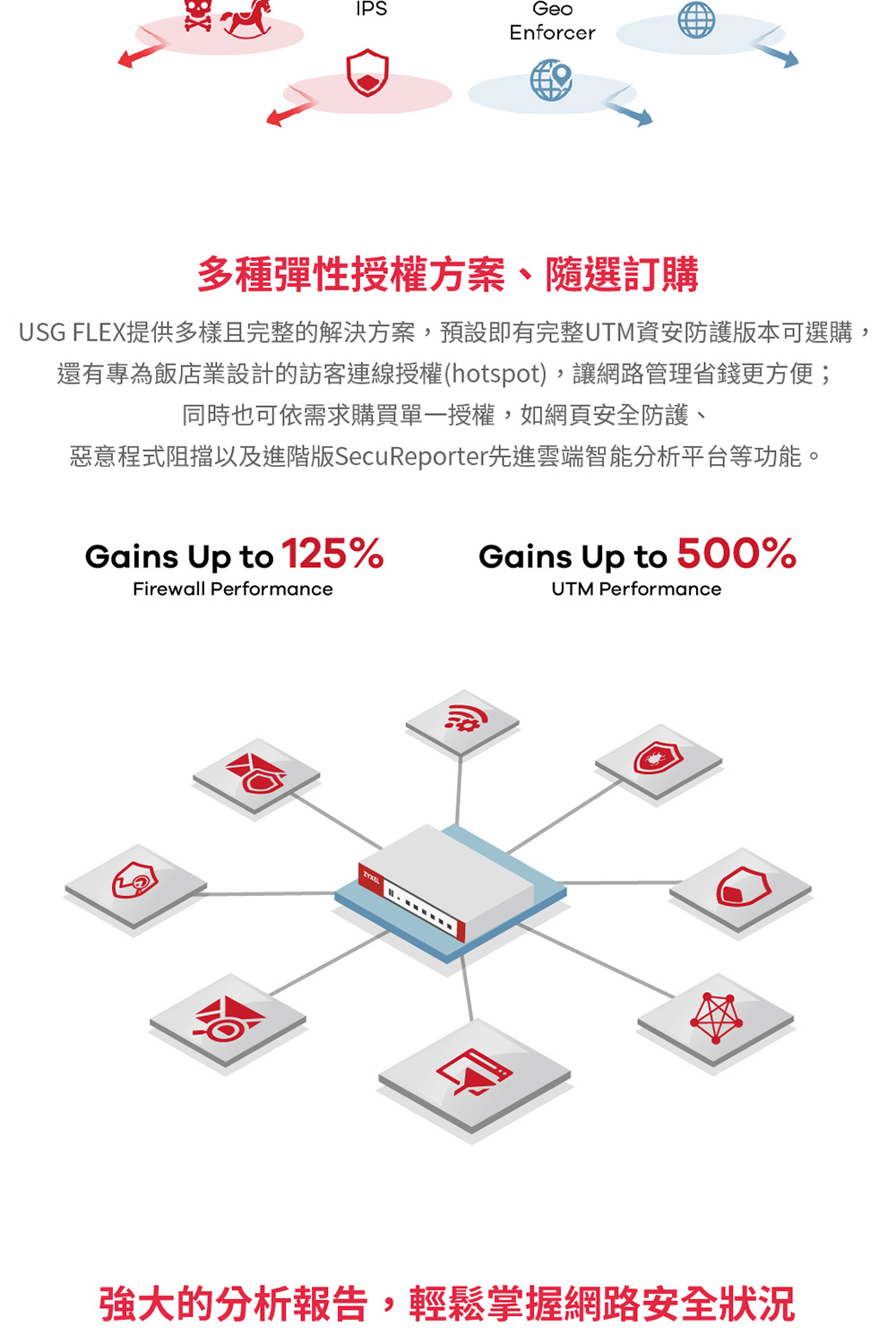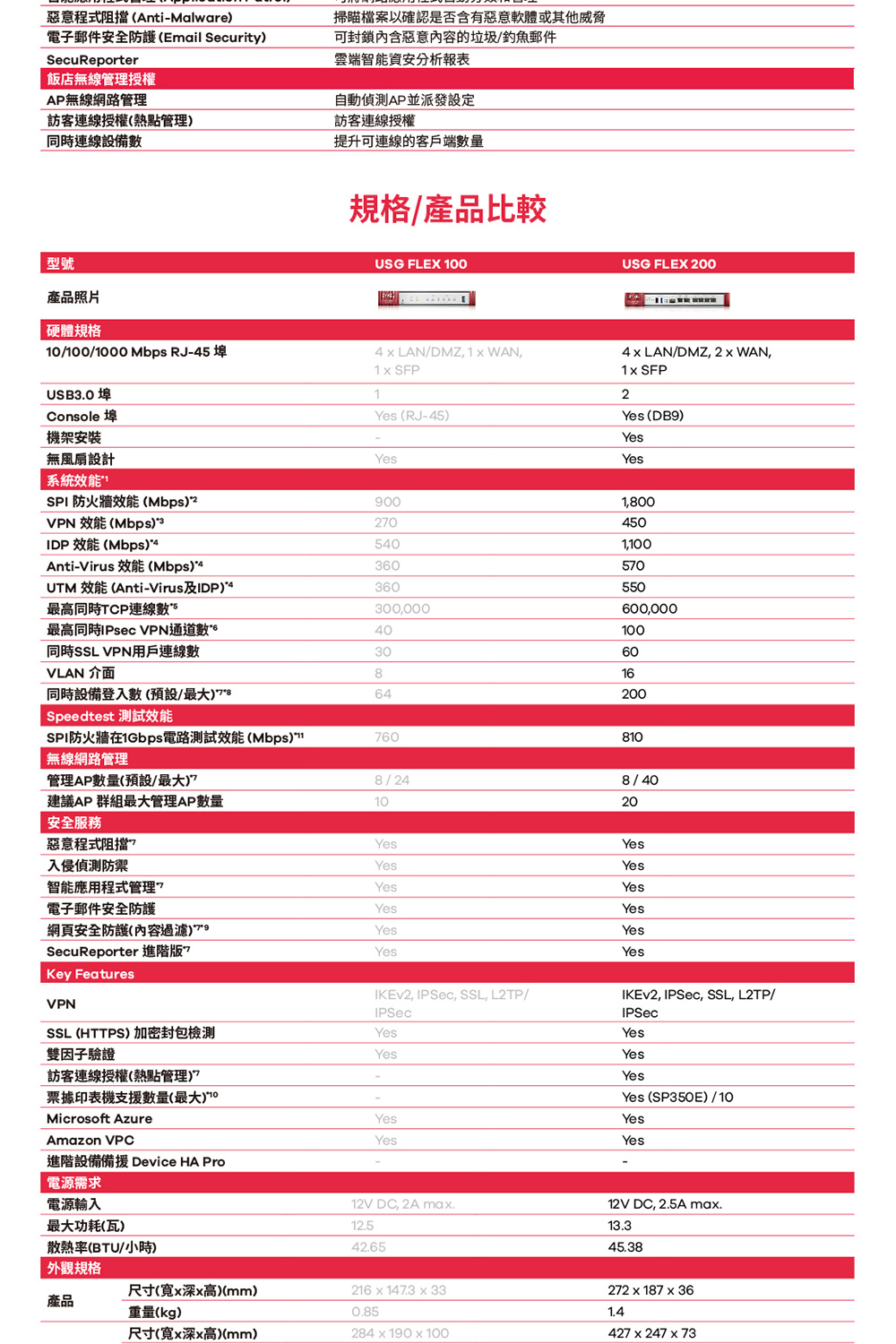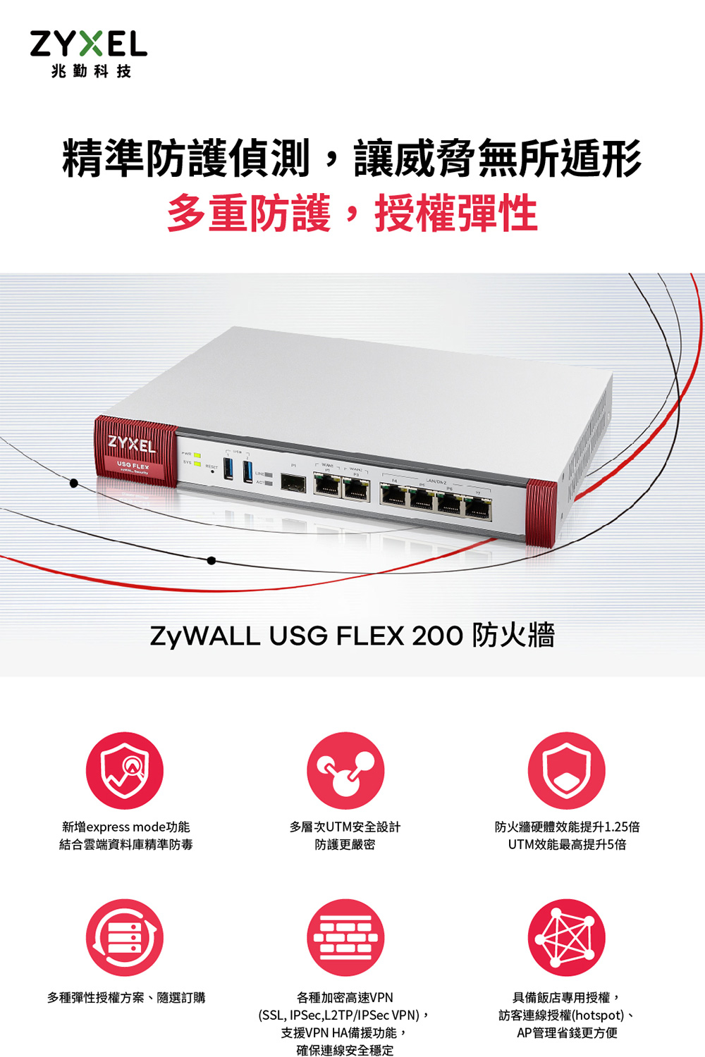 ·具備LAN/DMZ/WAN 10/100/1000Mbps RJ-45外,全系列皆具備SFP,應用 彈性、設定靈活·多種彈性授權可選,包含無線網路控制器、無線熱點管理功能、各種資安防護授權·具備IPSec VPN與SSL VPN功能,滿足中小企業異地辦公(WFH)需求/ICSA 認證防火牆