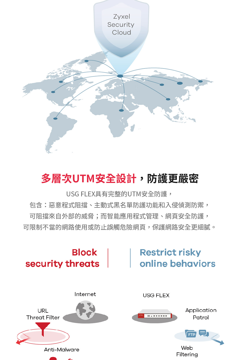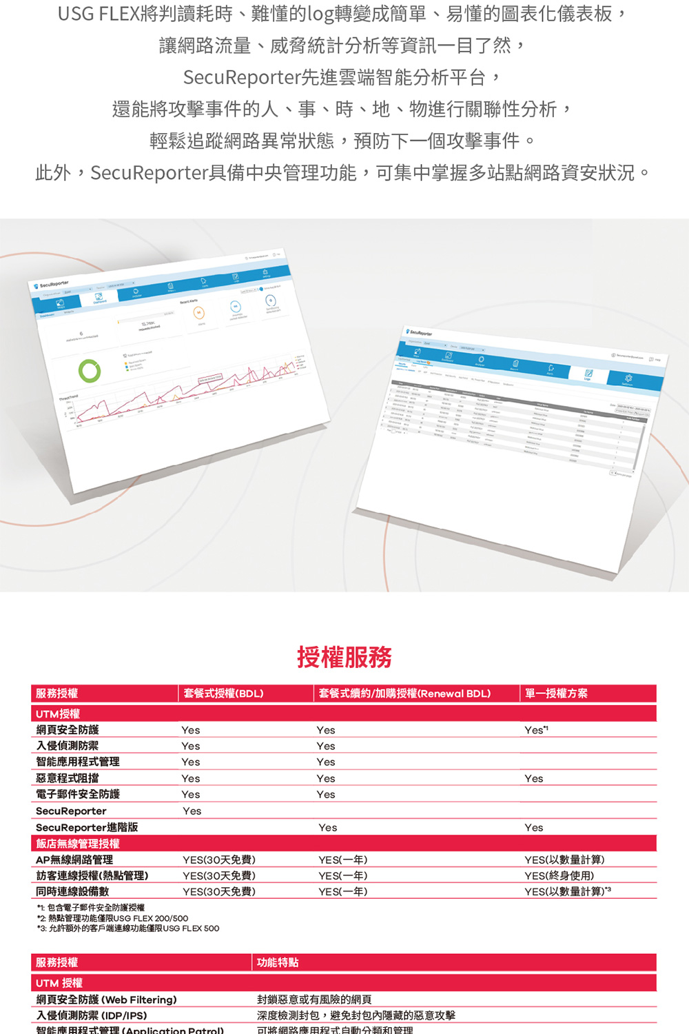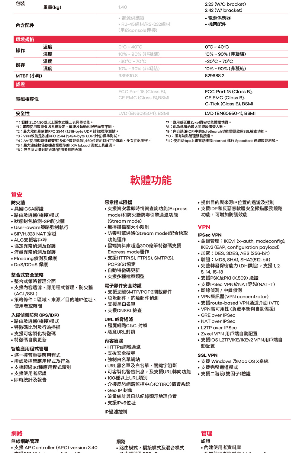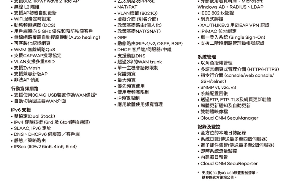 ·具備LAN/DMZ/WAN 10/100/1000Mbps RJ-45外,全系列皆具備SFP,應用 彈性、設定靈活·多種彈性授權可選,包含無線網路控制器、無線熱點管理功能、各種資安防護授權·具備IPSec VPN與SSL VPN功能,滿足中小企業異地辦公(WFH)需求/ICSA 認證防火牆