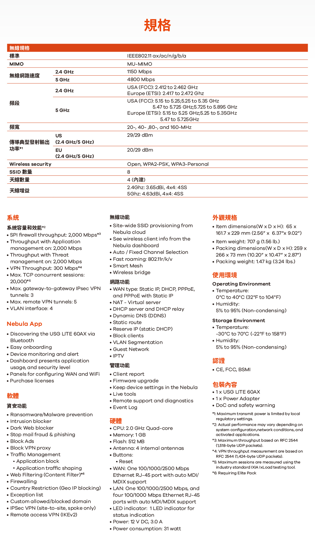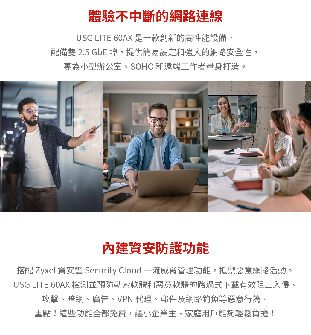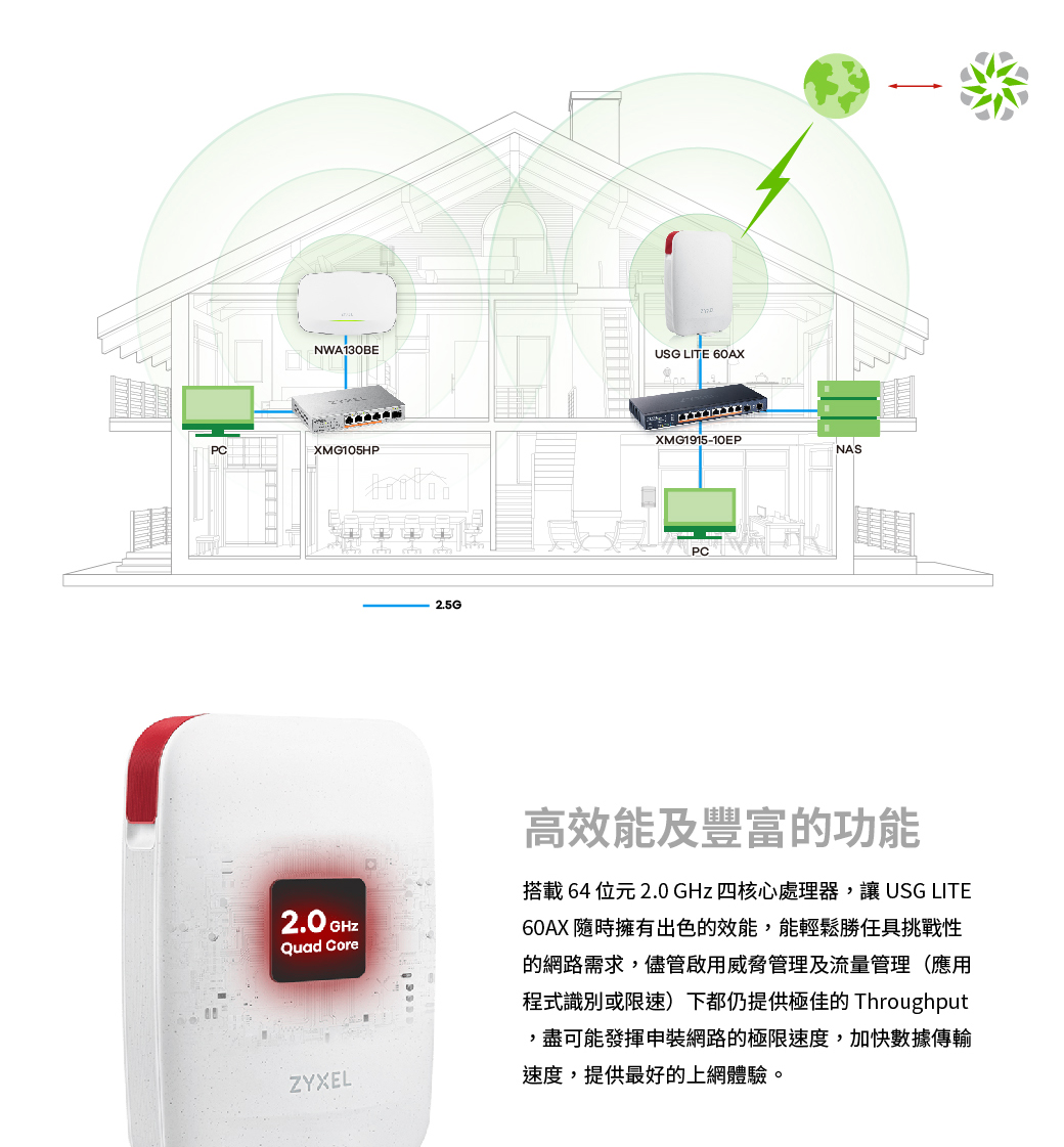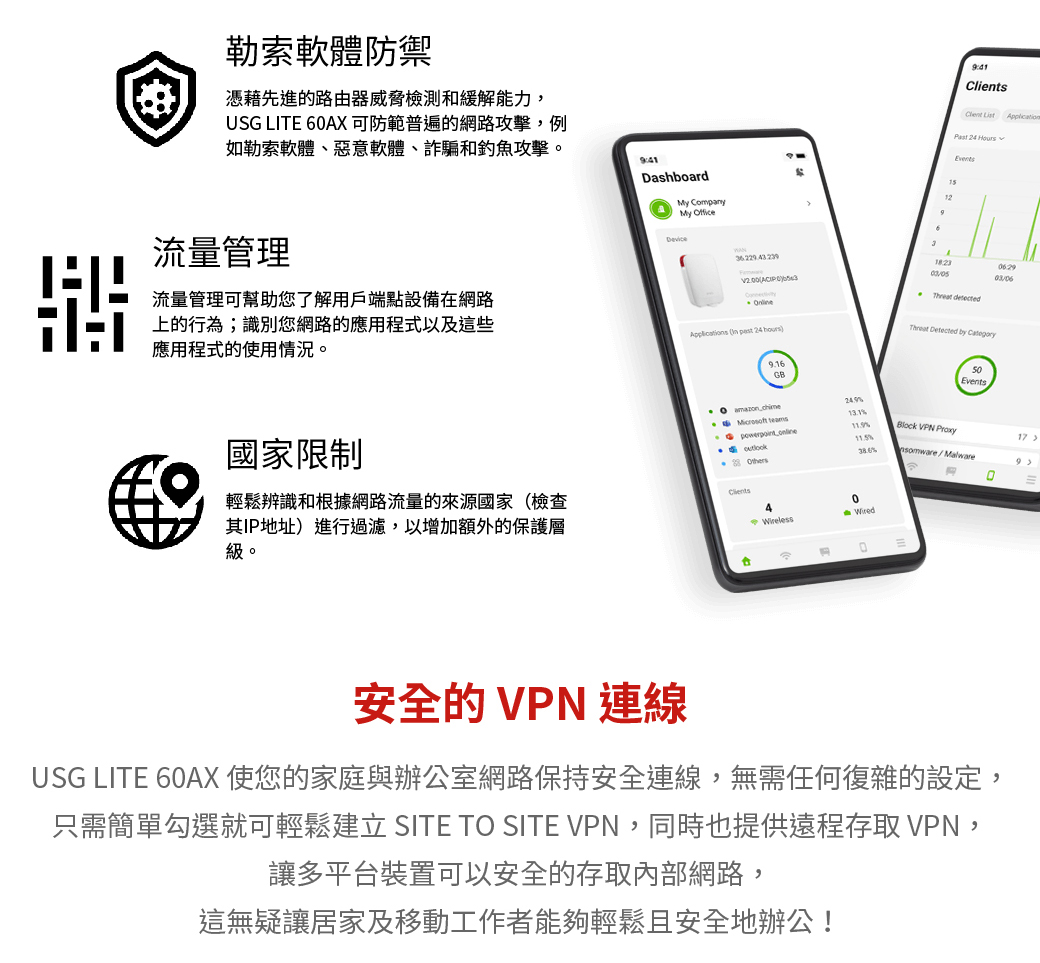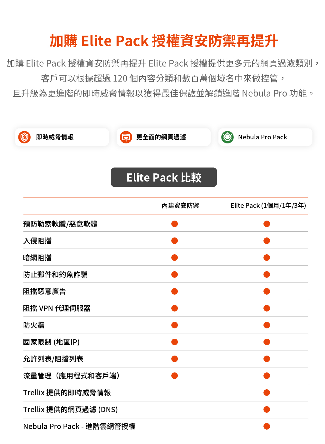 提供防火牆/ GeoIP/ Site-to-site VPN等功能免訂閱資安防護 -包括阻擋勒索軟體/惡意軟體、入侵阻擋、阻擋惡意廣告等功能可升級 Elite Pack 防護授權-提供Trellix即時威脅情報/網頁過濾(DNS)/NebulaPro等功能