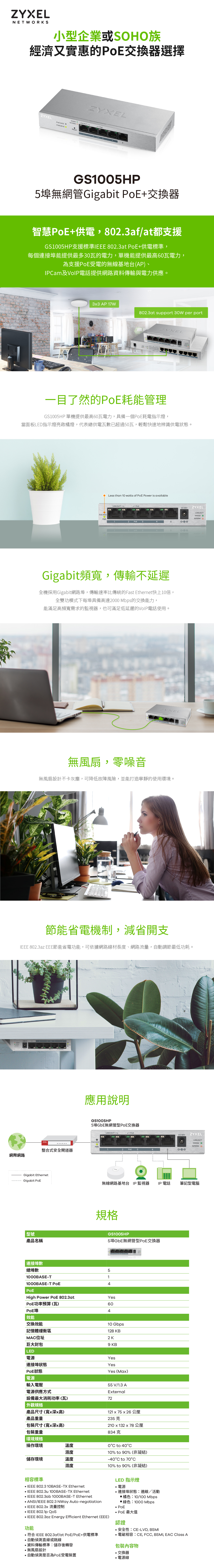 Zyxel 合勤 GS1005HP 無網管型5埠Gigabit PoE交換器(金屬殼) 名世購物網