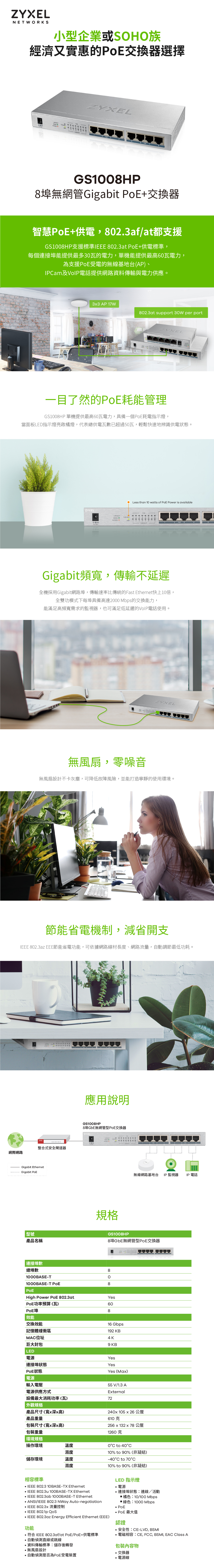 智慧PoE+供電,802.3af/at都支援/隨插即用,無需再做額外設定,不須額外配置電力來源節能省電功能,自動調節最低功耗/無風扇設計帶來寂靜無聲的運轉體驗提供小型企業或SOHO族經濟又實惠的PoE交換器選擇/原廠三年保固