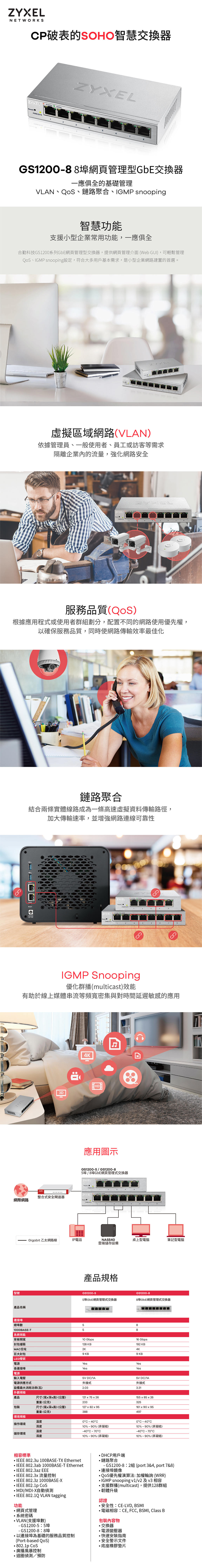 VLAN、QoS、鏈路聚合、IGMP snooping一應俱全/QoS配置網路使用優先權IEEE 802.3az節能技術/無風扇設計/堅固金屬外殻散熱快/可掛牆安裝全機享有原廠三年保固