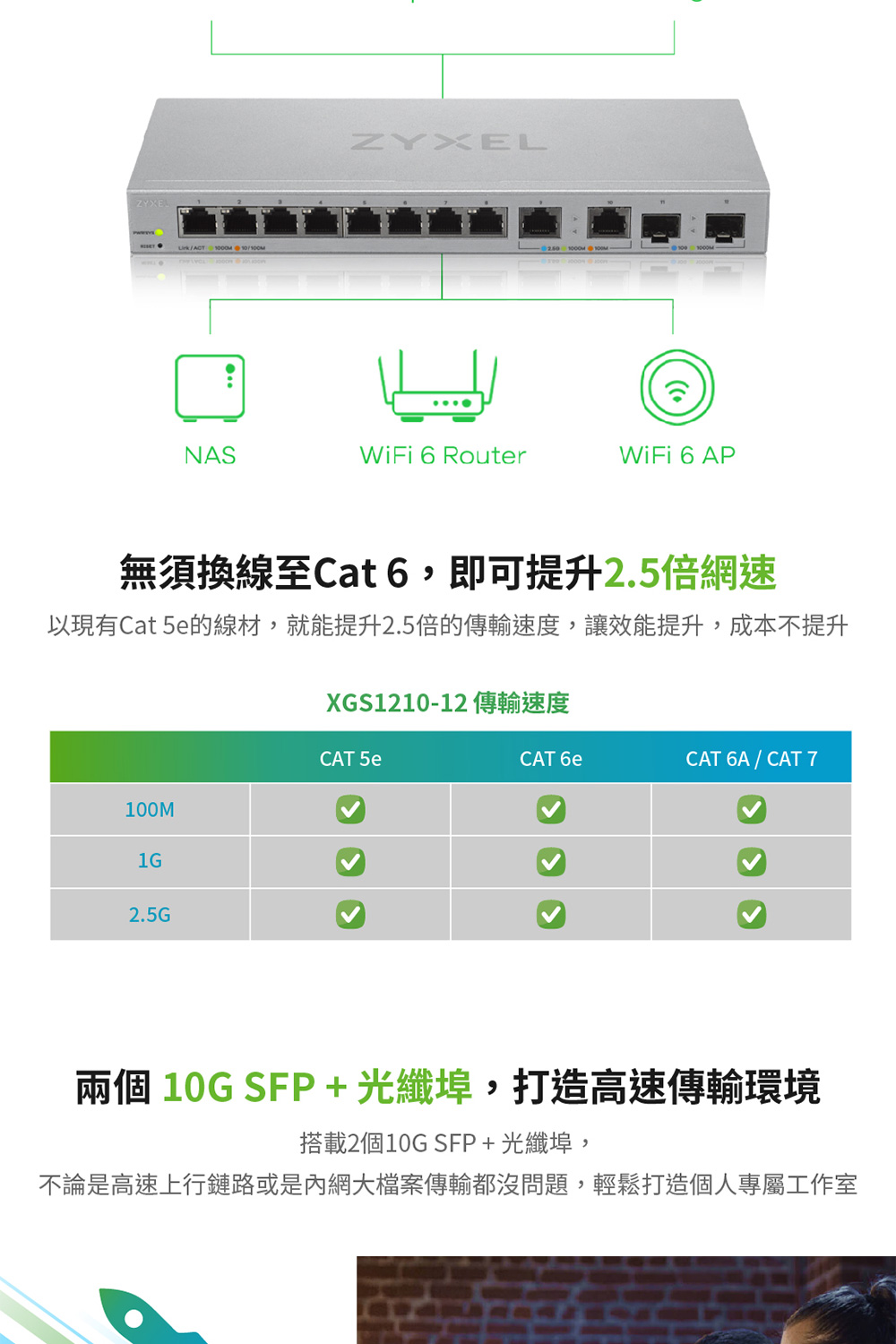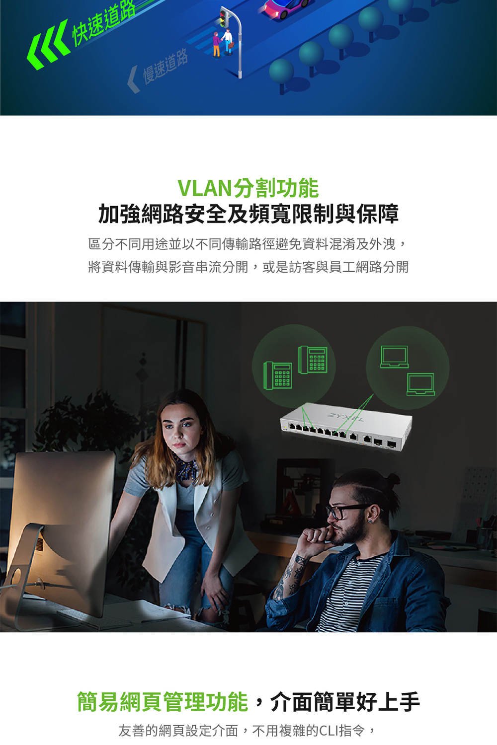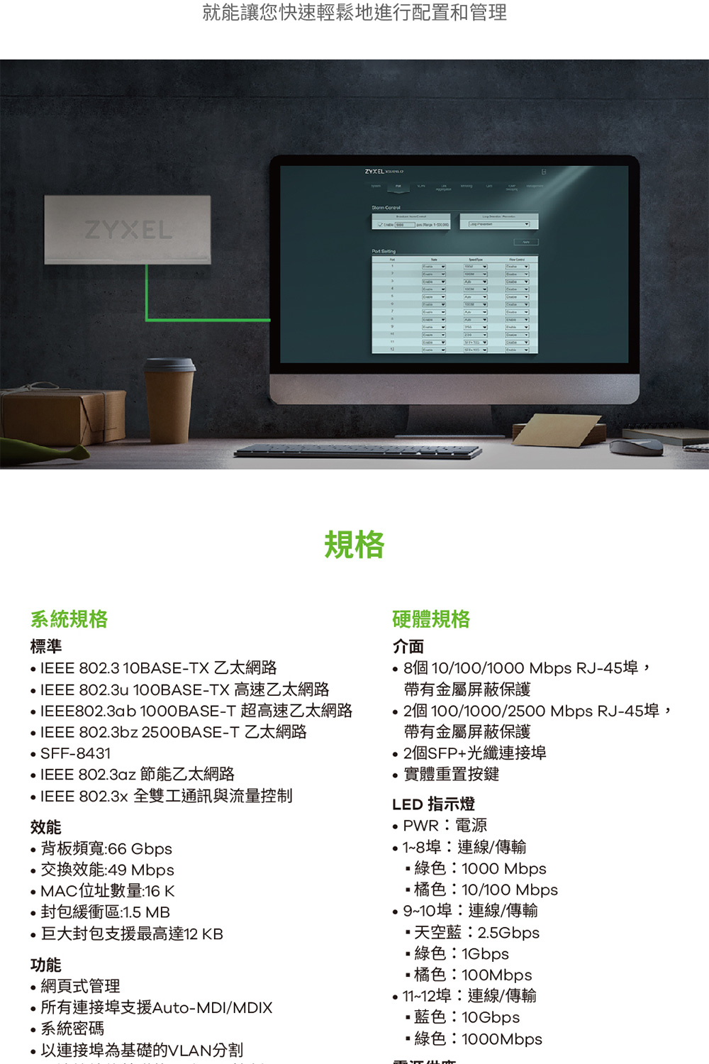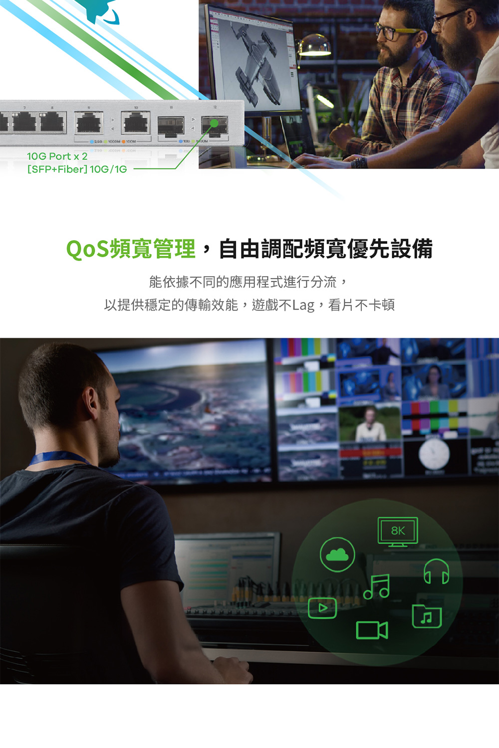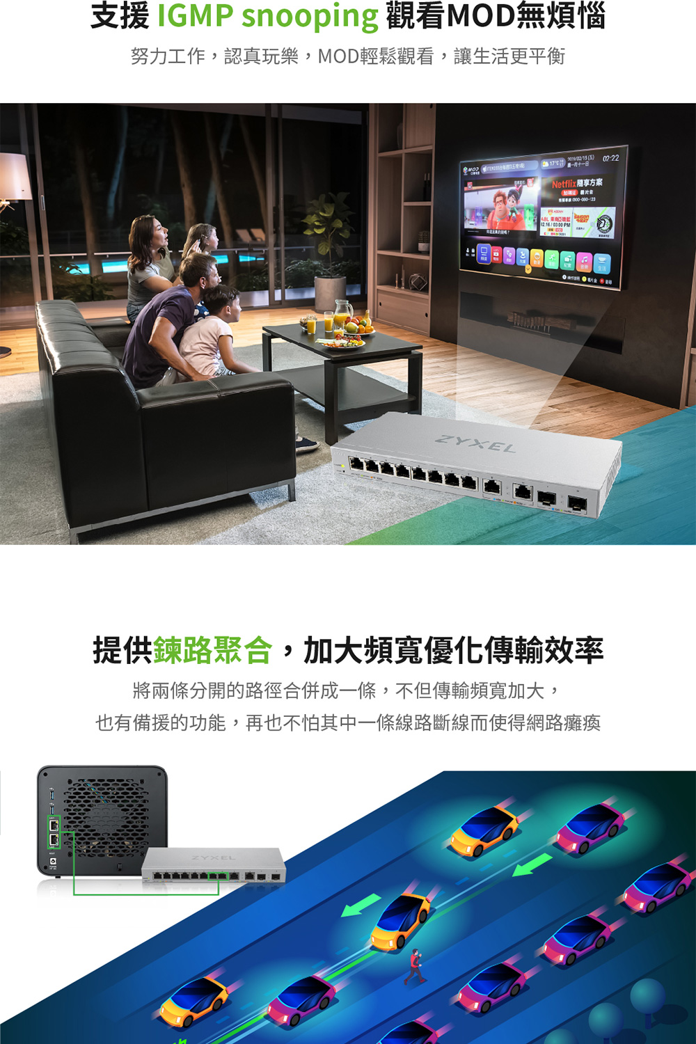 藉由10G SFP+光纖埠,就能將資料從NAS或工作站快速傳輸到使用者終端裝置搭載2個2.5G 乙太網路接孔,專為新世代2.5G主機板設計,立刻提升2.5倍網速支援IGMP snooping,觀看MOD無煩惱