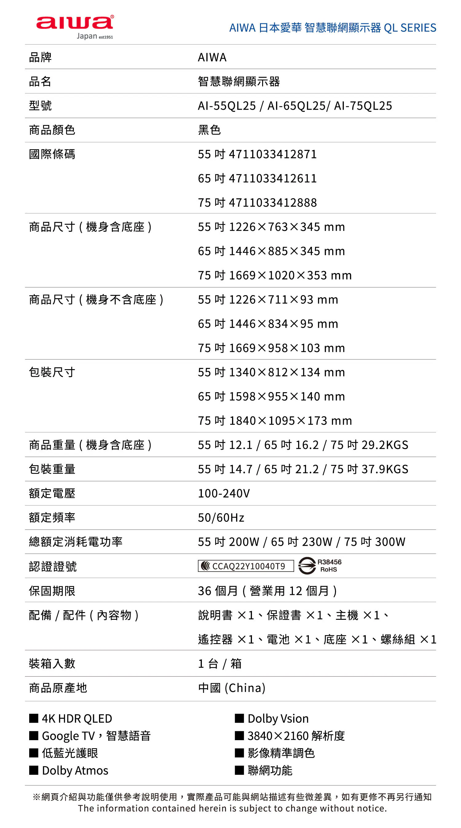 AIWA 愛華 75吋 4K QLED AI-75QL25智慧型顯示器